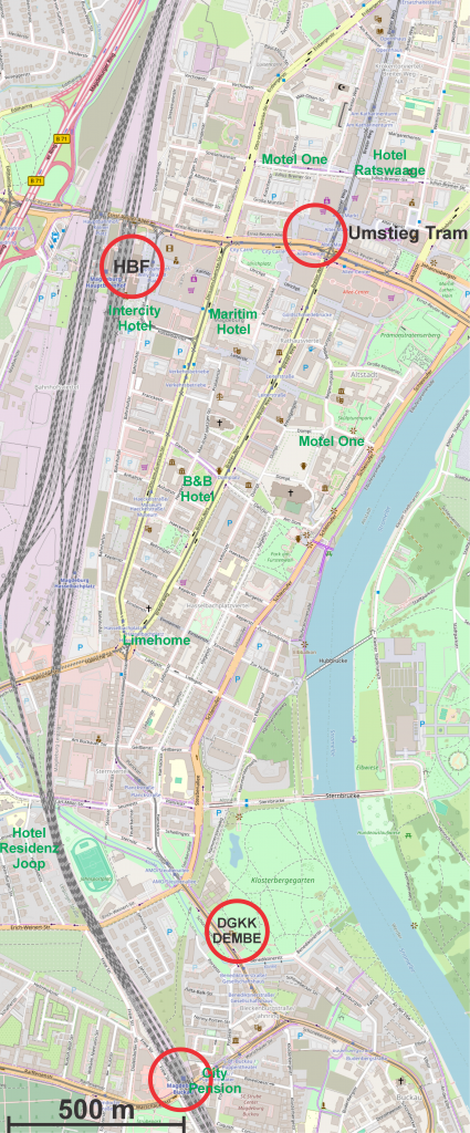Overview of Magdeburg center and workshop site and some hotels in Magdeburg in green letters.
